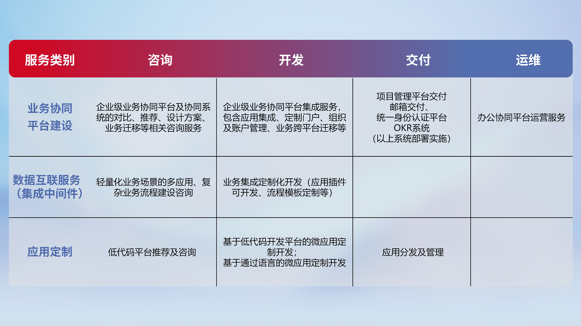 针对钉钉、、企微、、、、IDaas等平台级产品提供产品的规划、、方案、、、交付、、、、定制化开发等服务,,,实现如统一协同办公、、智能客户服务、、、混合会议管理、、、、智能数据查询、、、等业务场景,,实现数字化转型。。。。
